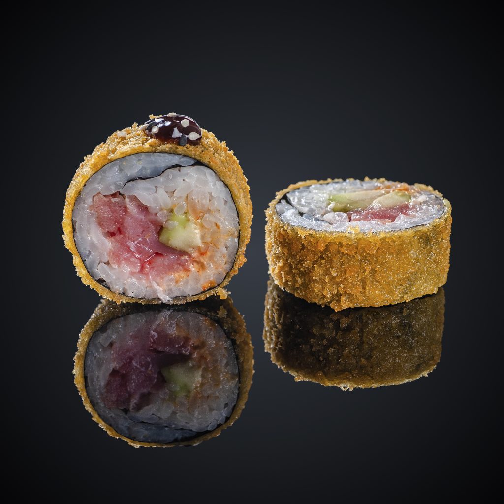 Тунец, авокадо,соус Спайси, панировочные сухари, кляр, кунжут, нори, рис.