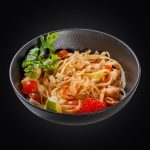 Состав: соус том-ям, моцарелла, креветки, кальмары, томаты черри, шампиньоны, лук красный, лук зеленый, кинза, кунжут.