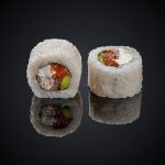 Состав: лосось, тунец, креветка, огурец, сыр “Cremette”, нори, рис.