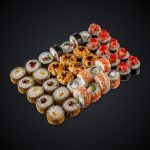 Состав: мидии, снежный краб, огурец, икра красная, соус “Гавайский”, нори, рис.