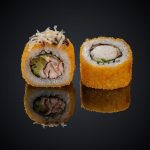 Состав: снежный краб, майонез, авокадо, огурец, икра “Масаго”, нори, рис.