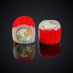 Состав: креветка, авокадо, огурец, майонез, икра “Масаго”, нори, рис.