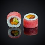 Состав: лосось, авокадо, огурец, майонез, икра “Масаго”, нори, рис.