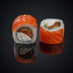 Состав: лосось, авокадо, огурец, майонез, икра “Масаго”, нори, рис.