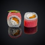 Состав: лосось, авокадо, огурец, майонез, икра “Масаго”, нори, рис.