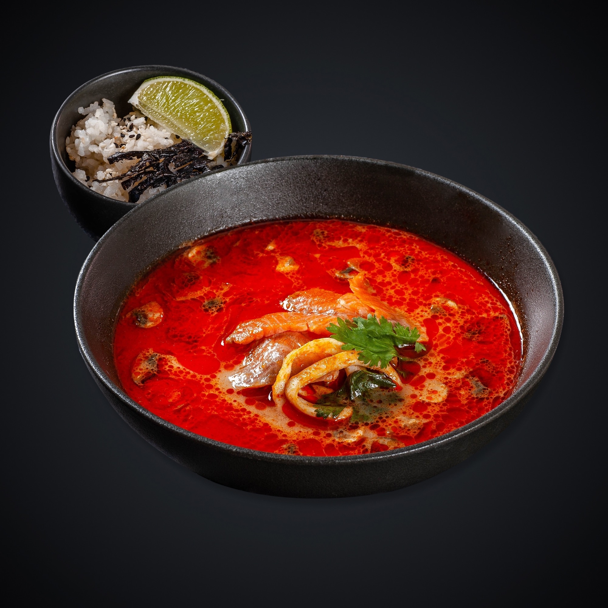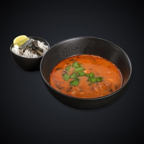 Лосось, кальмары, грибы “Шампиньоны”, томаты “Черри”, паста “Том Ям”, кокосовое молоко, лук красный, кинза, лайм, нори, рис.