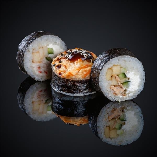 Тунец, креветка, огурец, сыр “Cremette”, яблоко, соус “Секрет”, соус “Унаги”, кунжут, нори, рис.
