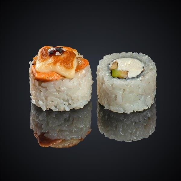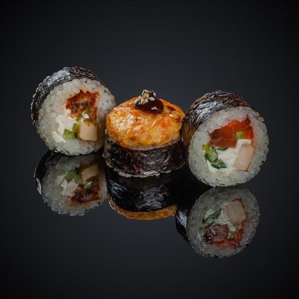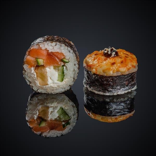 Лосось, авокадо, сыр “Cremette”, сыр “Моцарелла”, соус “Спайси”, соус “Унаги”, кунжут, нори, рис.