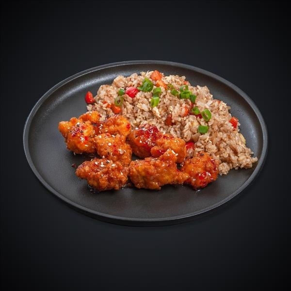 Куриное филе, яйцо куриное, кабачок, перец болгарский, морковь, лук зеленый, «Sweet chili sauce», соевый соус, кунжут, рис.