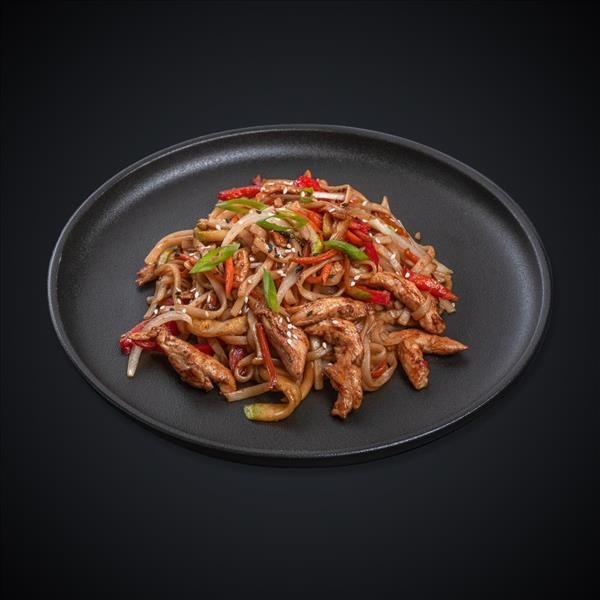 Куриное филе, лапша удон, кабачок, перец болгарский, морковь, лук зеленый, лук репчатый, соус Терияки, соевый соус, корень имбиря, чеснок, кунжут.