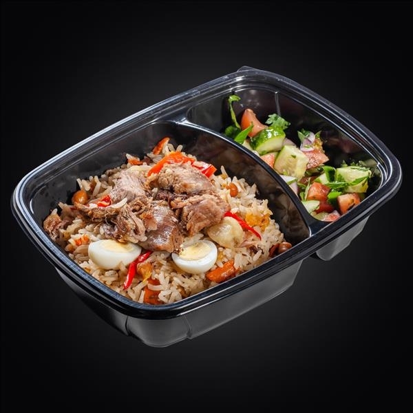 Говядина, бараний курдюк, рис, лук репчатый, морковь, масло растительное, специи, перец чили, чеснок, барбарис, нут. Подаётся с салатом из свежего огурца, помидора, красного лука и кинзы.