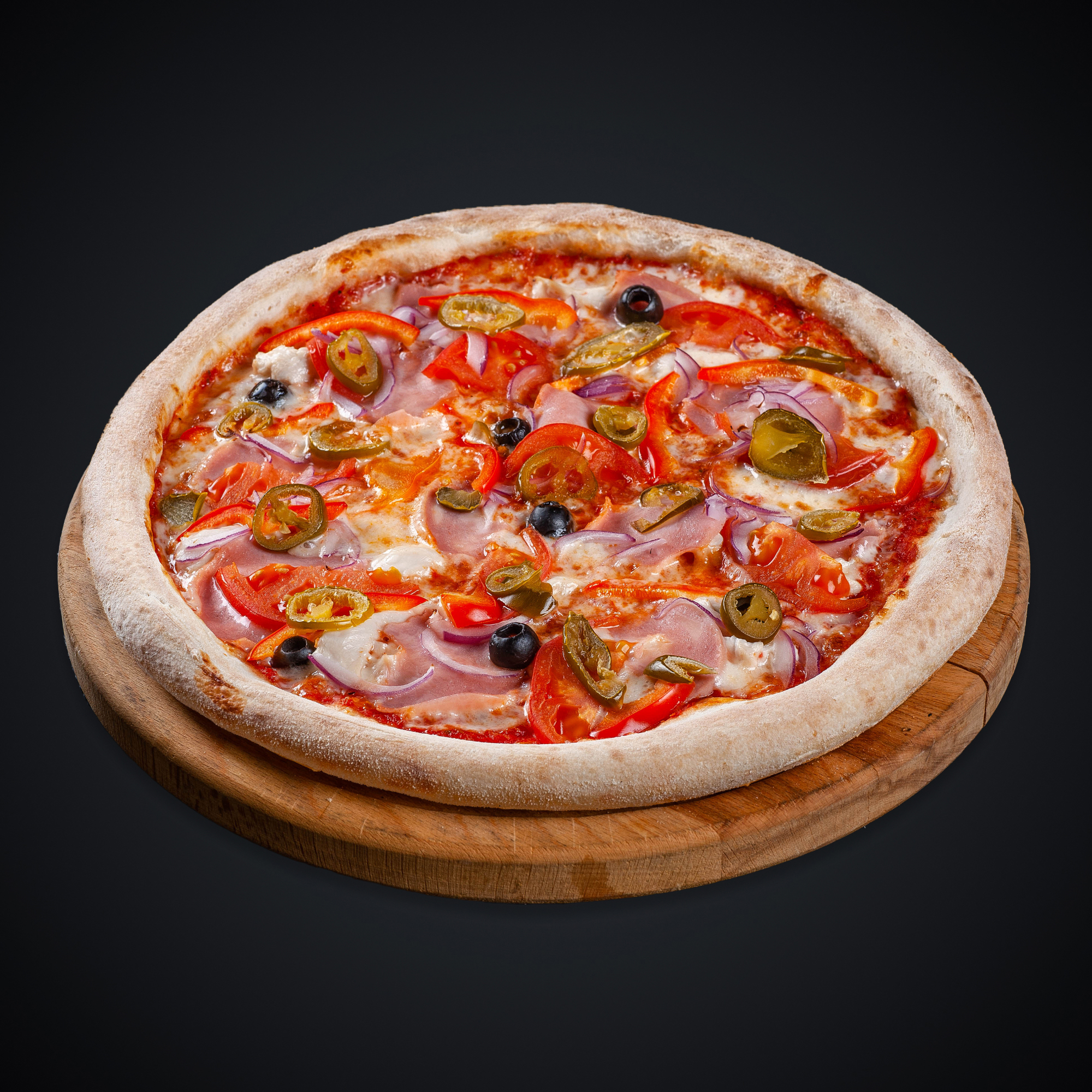 Состав: соус томатный, сыр моцарелла, куриное филе, ветчина индейки, помидоры, лук красный, маслины, перец болгарский, перец халапеньо.