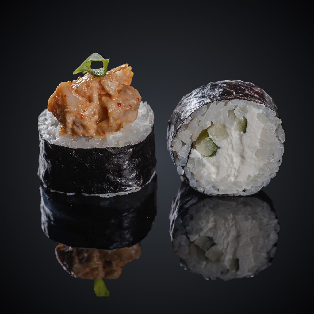 курица копченая, сыр “Cremette”, огурец, соус Спайси, лук зеленый, нори, рис.