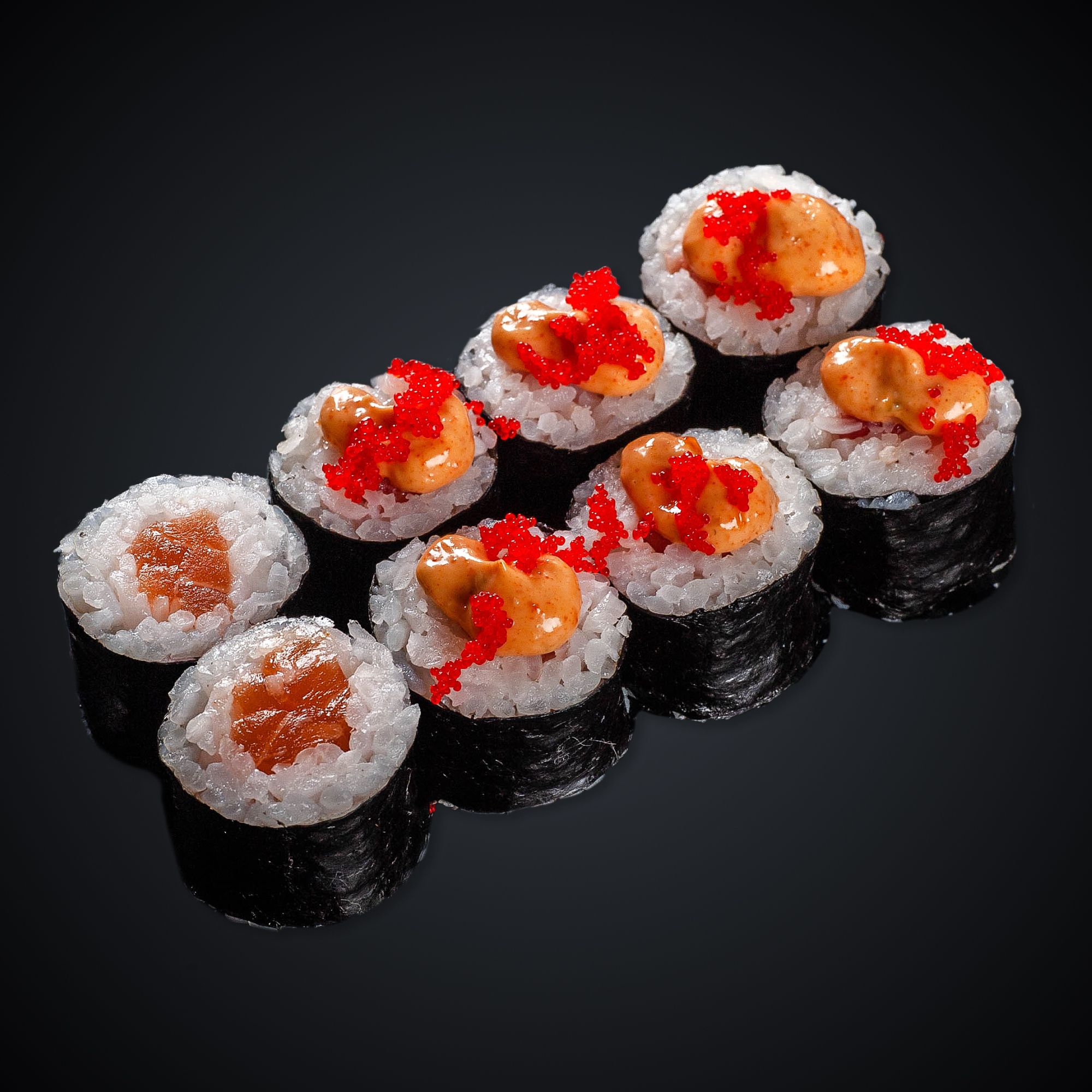 лосось,соус “Спайси”, икра “Масаго”, нори, рис.