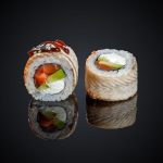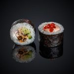 лосось,соус “Спайси”, икра “Масаго”, нори, рис.