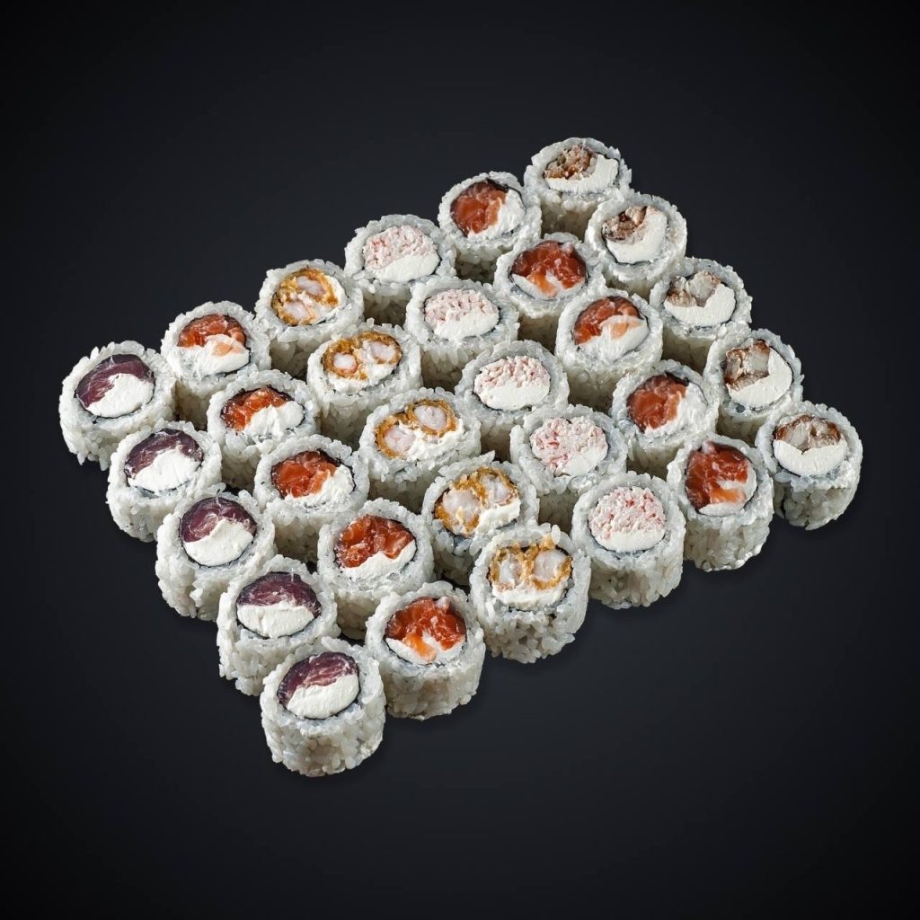 Состав: лосось, угорь, тунец, лосось копченый, креветка, креветка в темпуре, снежный краб, мидии, авокадо, сыр “Cremette”, нори, рис.