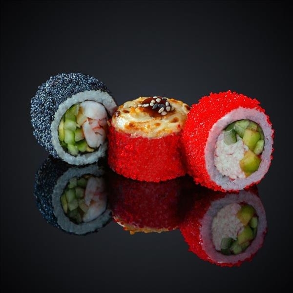Снежный краб, креветка, авокадо, огурец, икра “Масаго”, майонез, соус “Секрет”, соус “Унаги”, кунжут, нори, рис.